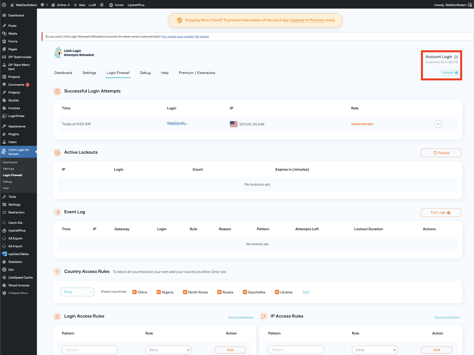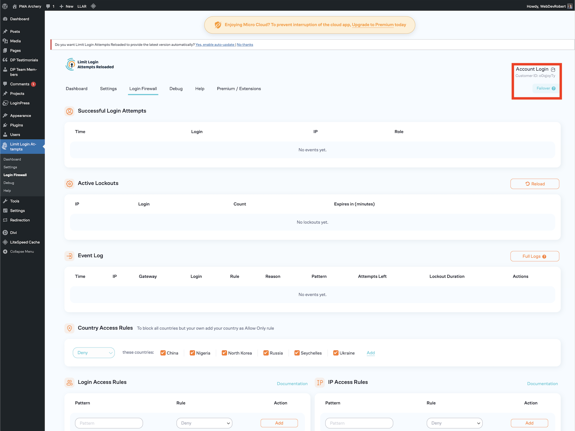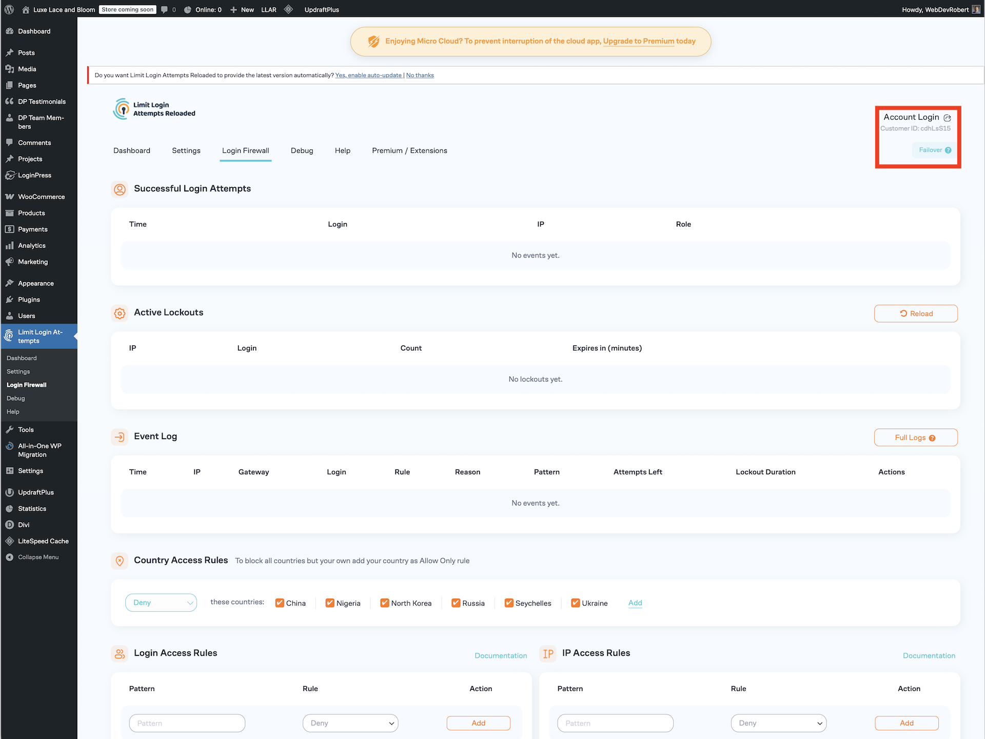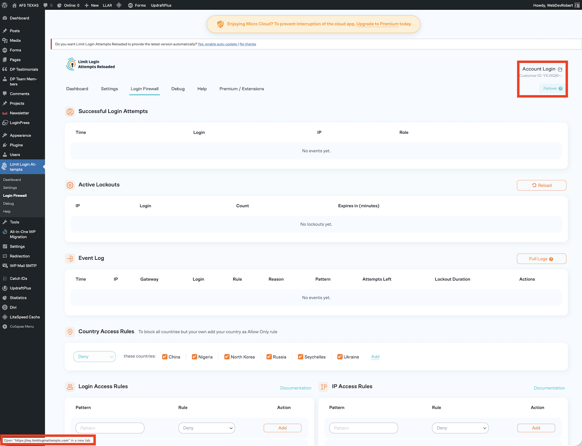 I manage all four of these websites. All four of them have Limit Login Attempts Reloaded installed on them. All four of them have the free “Micro Cloud” update. However, if you click on the “Account Login” link (identified with the red outline) and go to https://my.limitloginattempts.com you cannot login and see but one website. The other three do not have accounts associated with them, because the accounts are set up using the same user (email address) as the first.