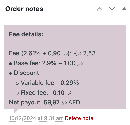 Hi , So I was testing woopayments in sandbox mode in my site & when I placed an order of 52dhs (UAE) with local pickup & card as payment method … I find in woocommerce > orders > order that transaction fee is 2.26dhs instead of 2.5dhs since according to this 2.9% + 1 Dhs is cut from each local transaction…
